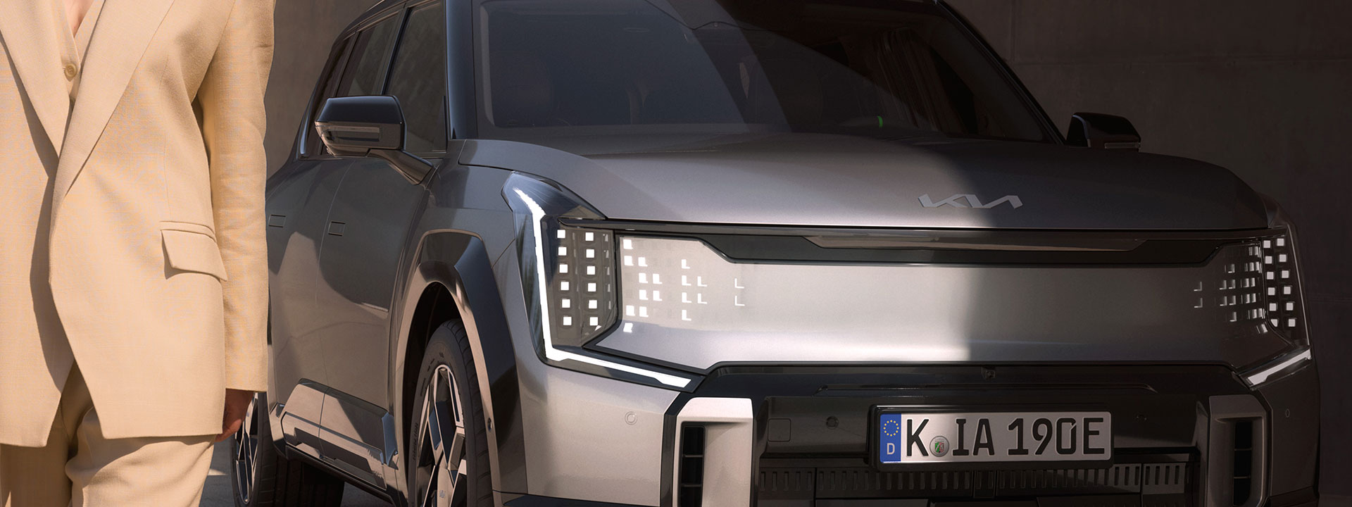 Das Lichtkonzept des EV9 GT überzeugt mit Stil und Funktion. Die kompakten Projektionsscheinwerfer im Würfeldesign werden durch den neuen digitalen Leuchtgrill mit animierter Lichtsignatur ergänzt – für maximale Wirkung schon beim ersten Blick.